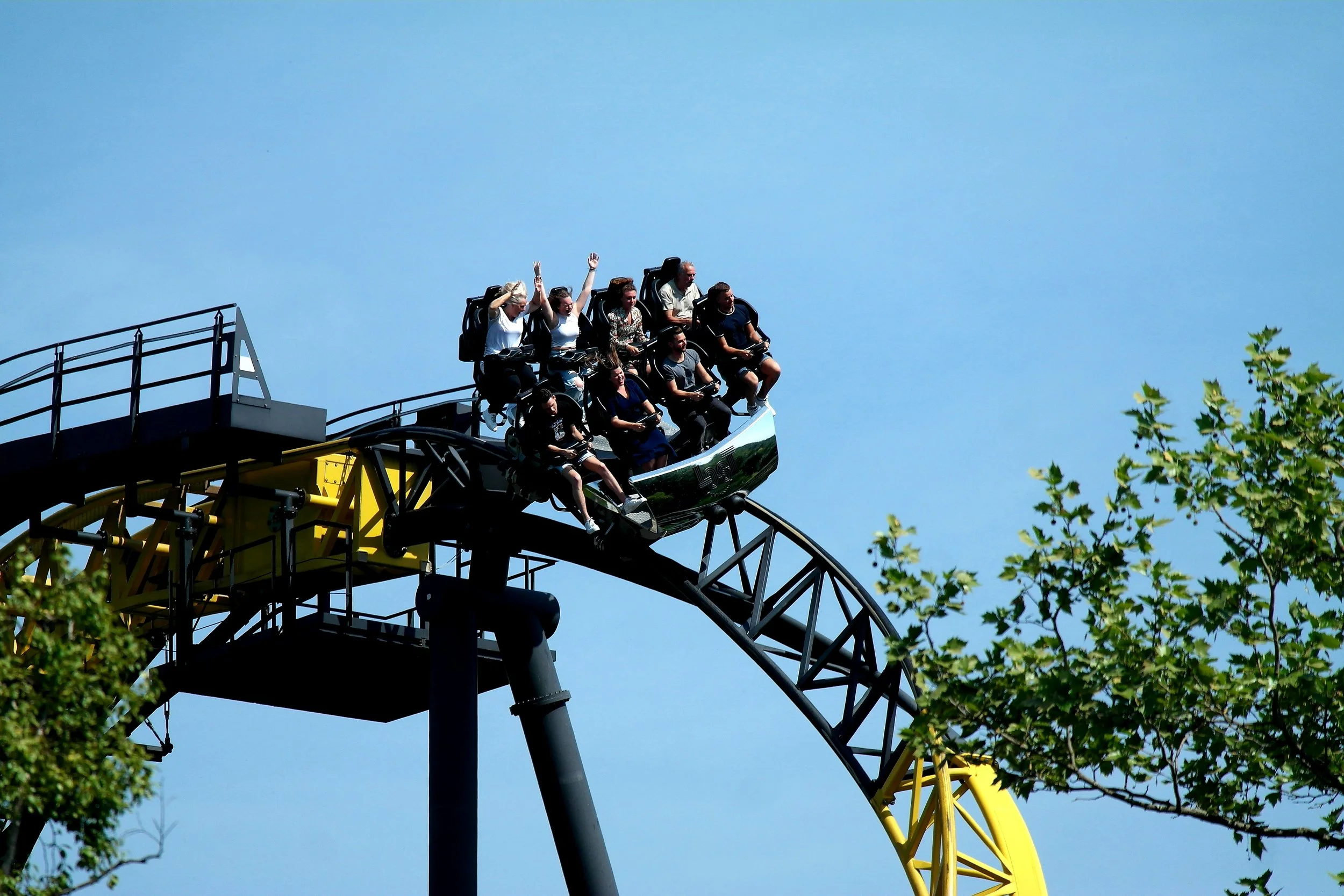 The black-and-yellow steel track takes you to a height of 32 metres and then sends you into the depths with a twisted drop. Lost Gravity reaches a top speed of 87 kilometres per hour, so you can cover the 680 metre long track in 82 seconds. The 4.3G, the two inversions and the Banked Top Hat give you that great feeling of weightlessness!